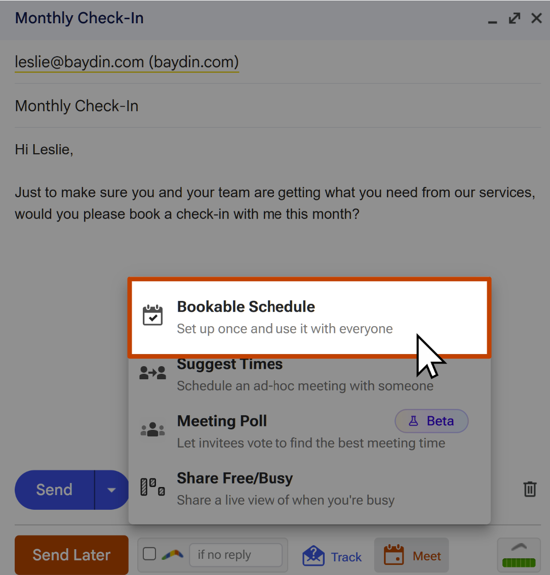 First, compose a new email, and click Meet, click Bookable Schedule, and then select the Bookable Schedule you want your recipient to use to book.