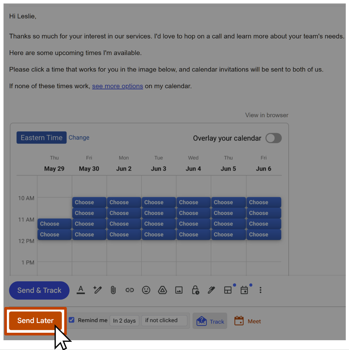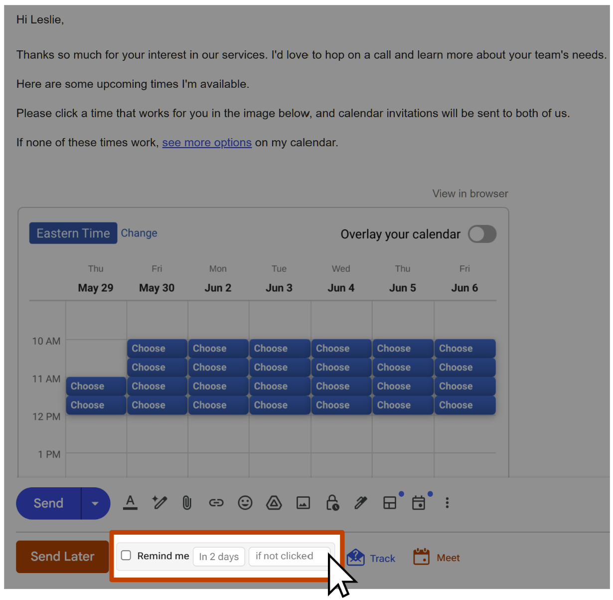 By combining these 4 features, you'll increase your booked meetings, gain useful tracking info, and well-timed follow-up reminders--all by standing out as an extra courteous correspondent to the recipient!
